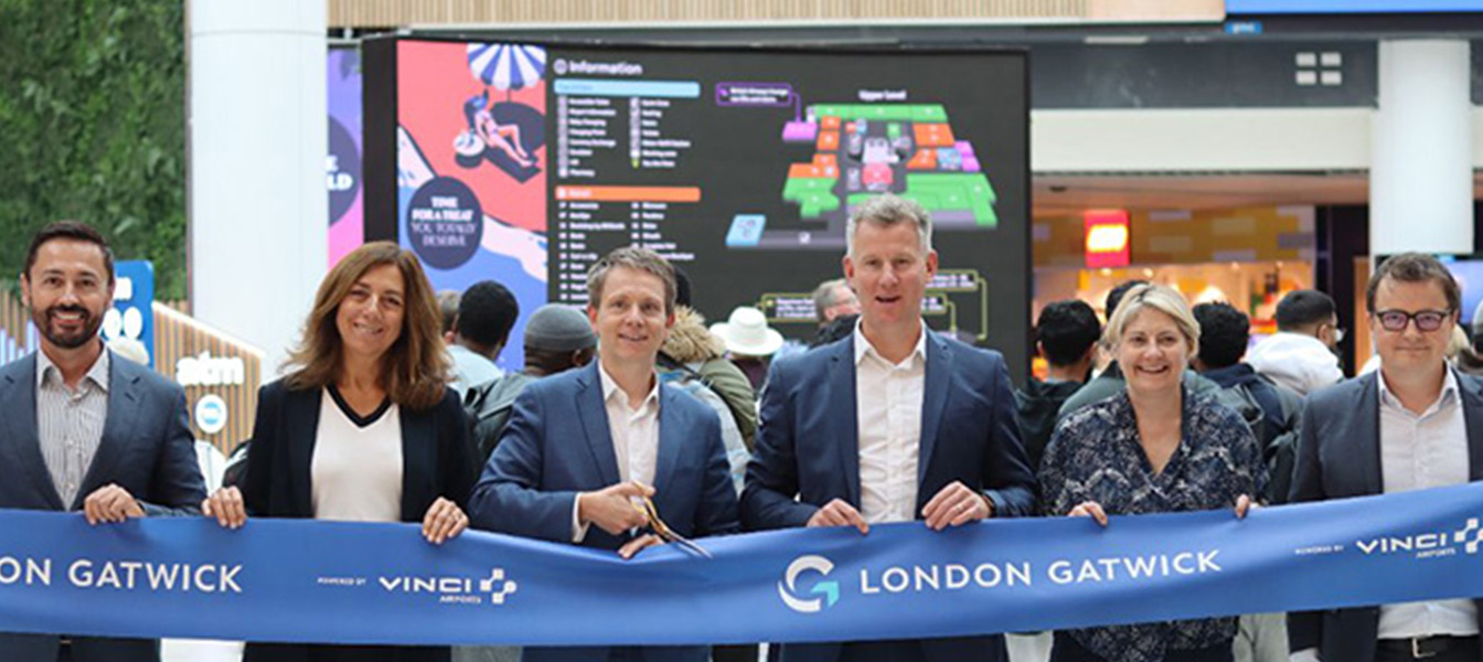 The completed curved digital wayfinding feature stands as a refined architectural statement within Gatwick South Terminal.