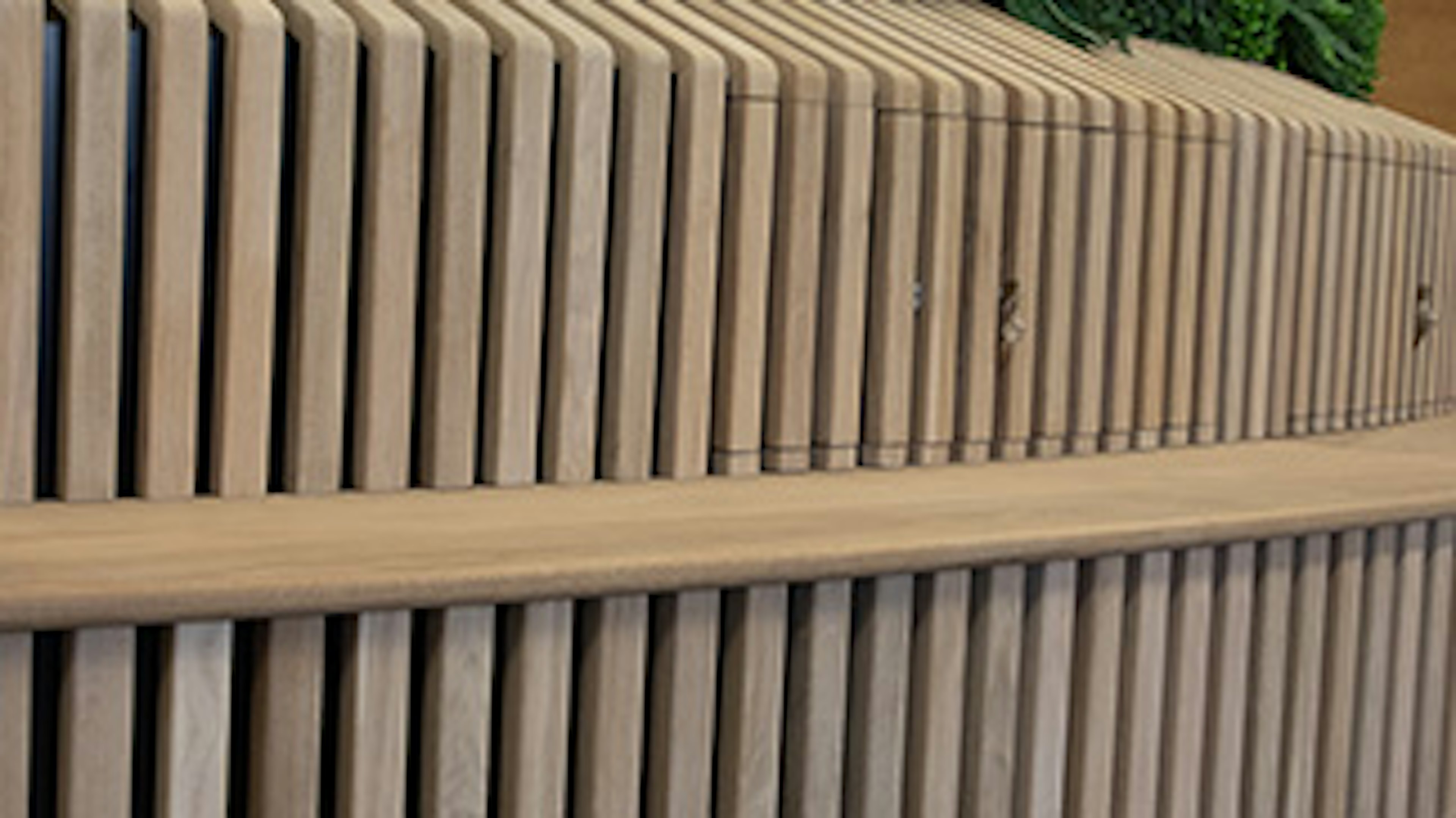 The rear elevation incorporates artificial foliage and a dedicated seating area, crafted from full-stave English Oak, slatted Oak elements feature pencil-rounded edges and a fire-retardant finish, adding warmth, texture and craftsmanship.