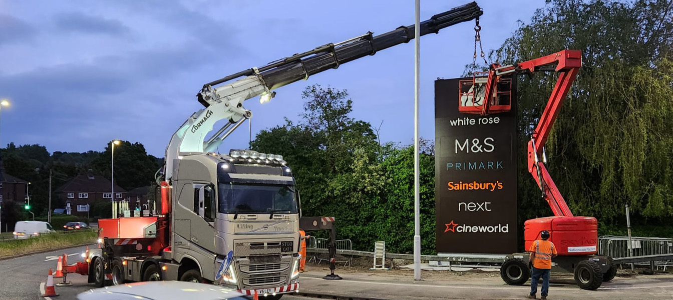 Working with our logistics partners we can schedule delivery to site ensuring the totem arrives exactly when our installation team requires it, we utilise HIAB crane lorries, mobile cranes and various logistical vehicles and machinery to ensure even the most difficult of installations can be achieved.